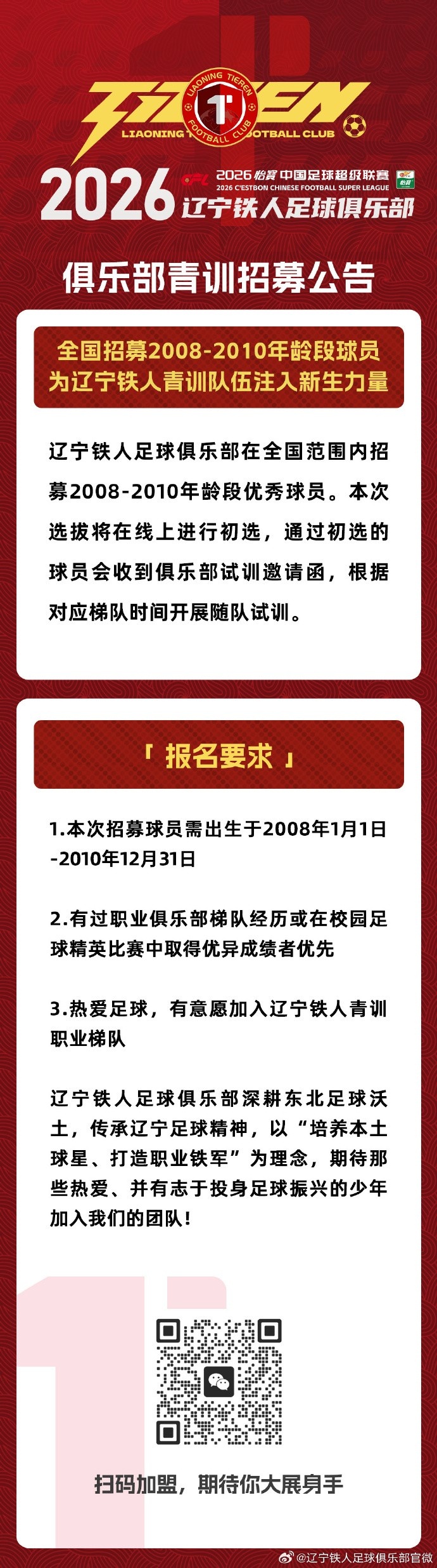 配资平台股票行情 辽宁铁人足球俱乐部2026青训招募!